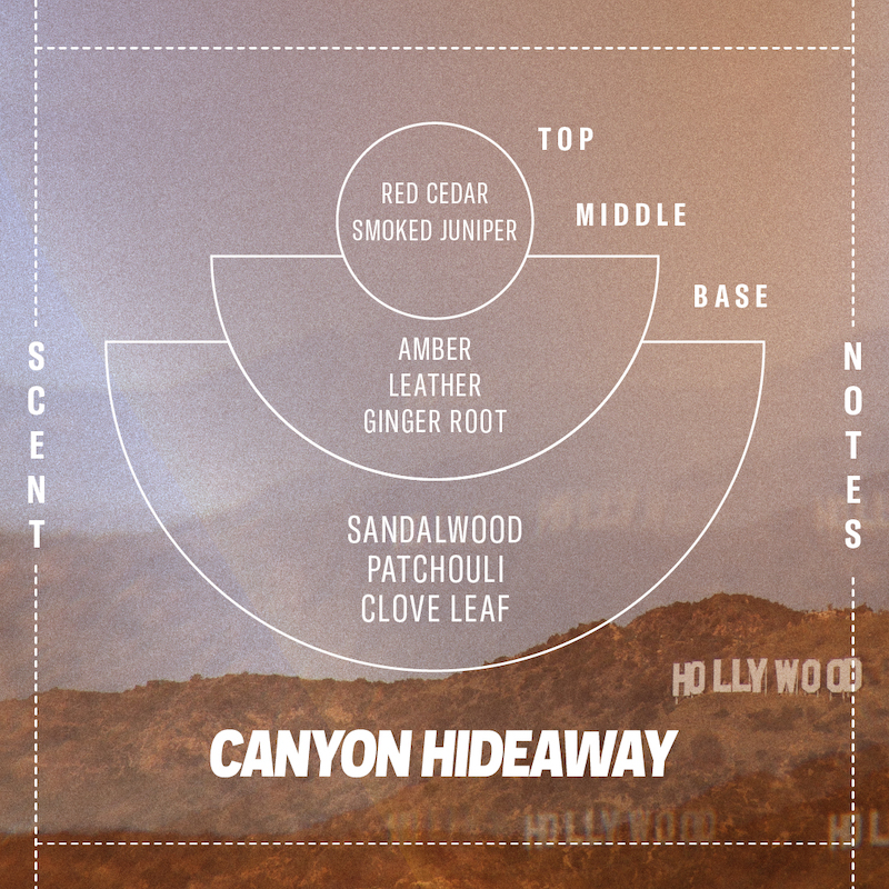 Dieser Duft erinnert an kurvenreiche Fahrten mit heruntergelassenen Fenstern, böhmische Hütten unter kalifornischen Eichen, das Aroma von sonnenverbrannter Erde und Chaparral. Holzig, rauchig, warm und harzig. Geräucherter Wacholder, Leder, Ingwerwurzel und Nelkenblatt.